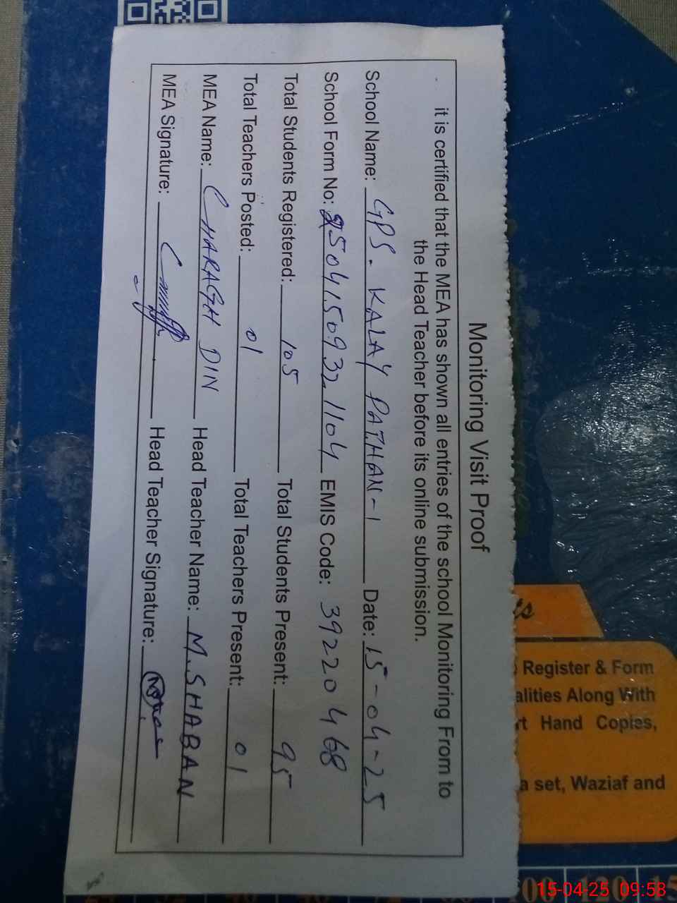 | EMIS Code: 39220468 | Name of School: GPS KALAY PATHAN NO 1 | |||