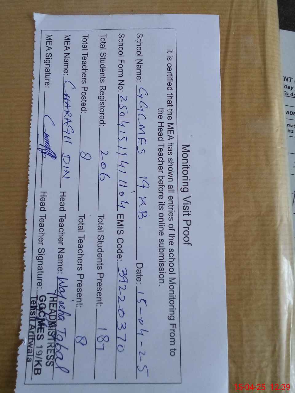 | EMIS Code: 39220370 | Name of School: GGCMES CHAK NO 19 KB | |||