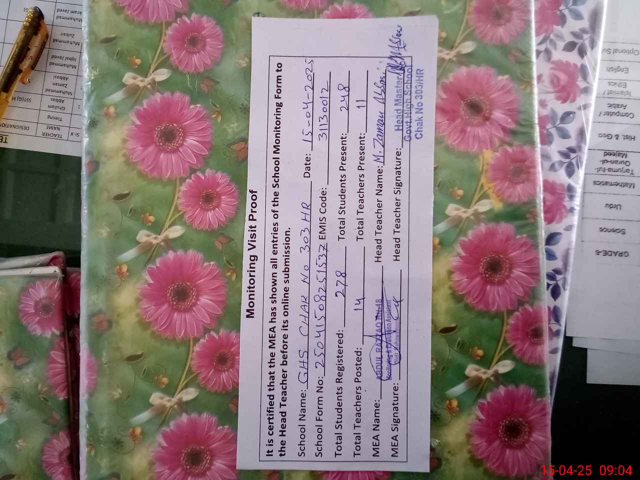 | Attendance Register | Head Teacher | MEA with School | Visit Proof |