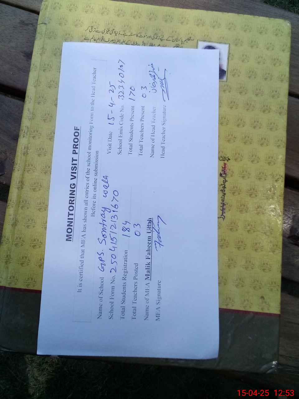| Attendance Register | Head Teacher | MEA with School | Visit Proof |
