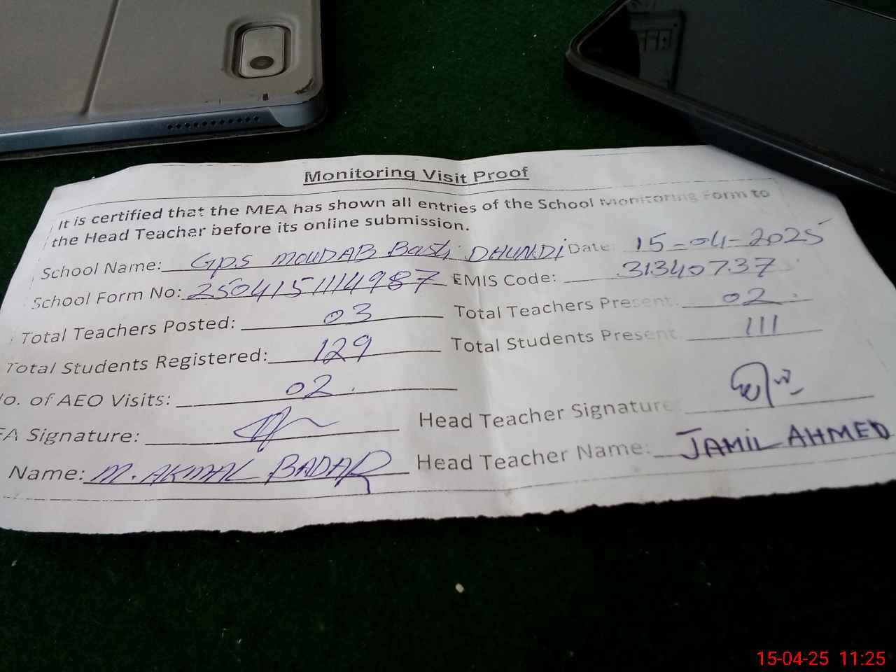| Attendance Register | Head Teacher | MEA with School | Visit Proof |