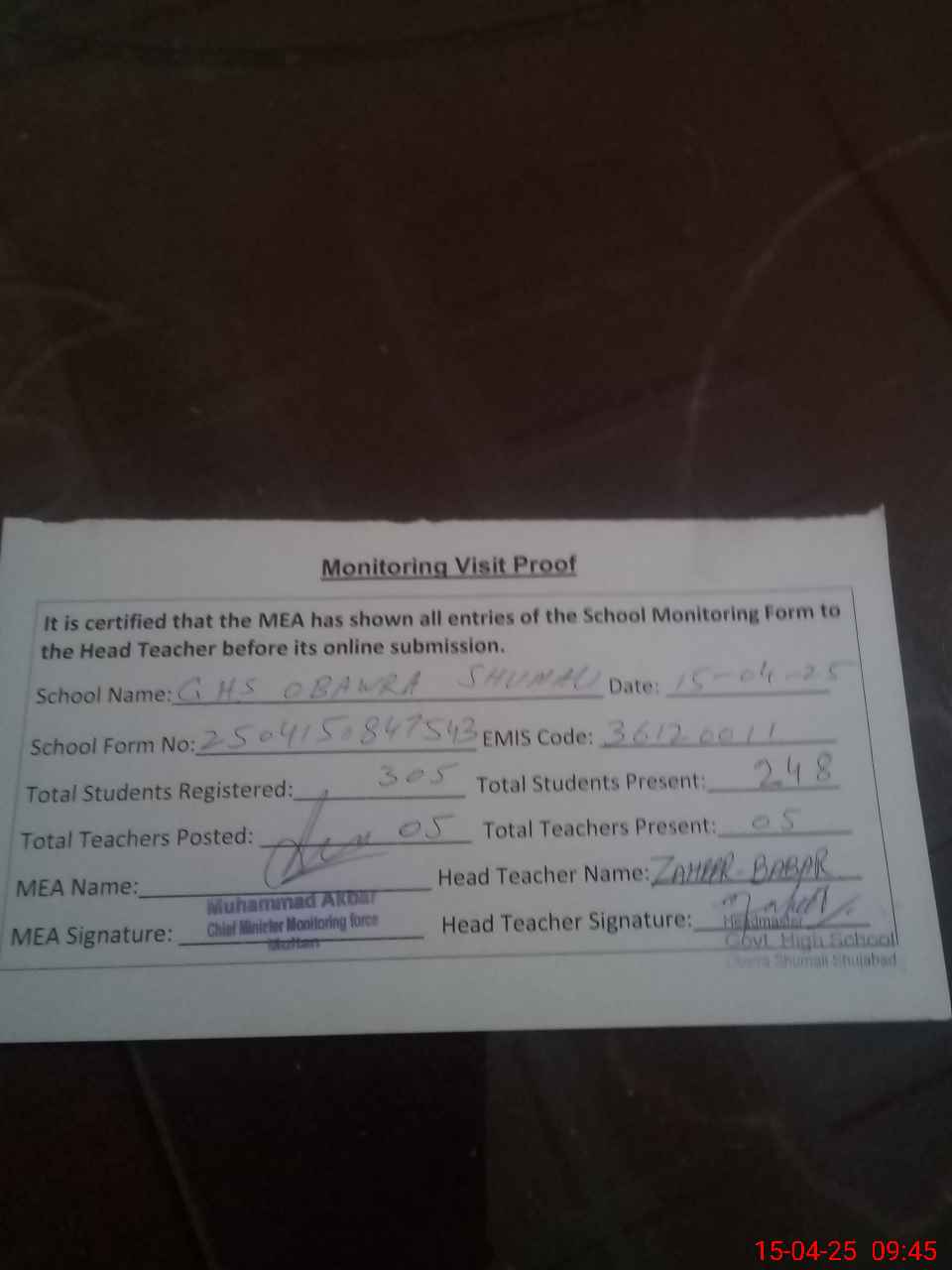 | EMIS Code: 36120011 | Name of School: GHS OBARA SHUMALI P/O SAME SHUJA ABAD | |||