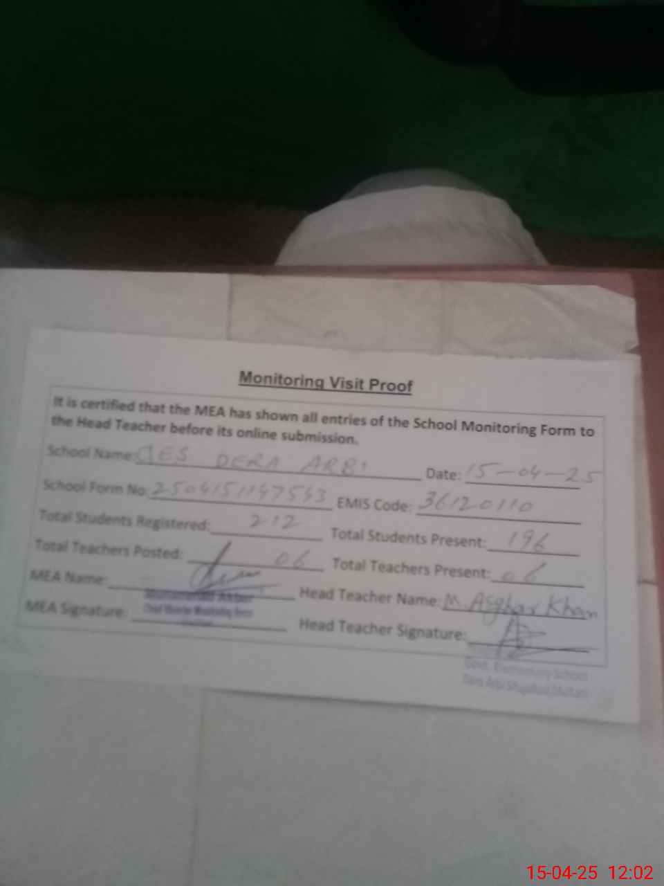 | Attendance Register | Head Teacher | MEA with School | Visit Proof |