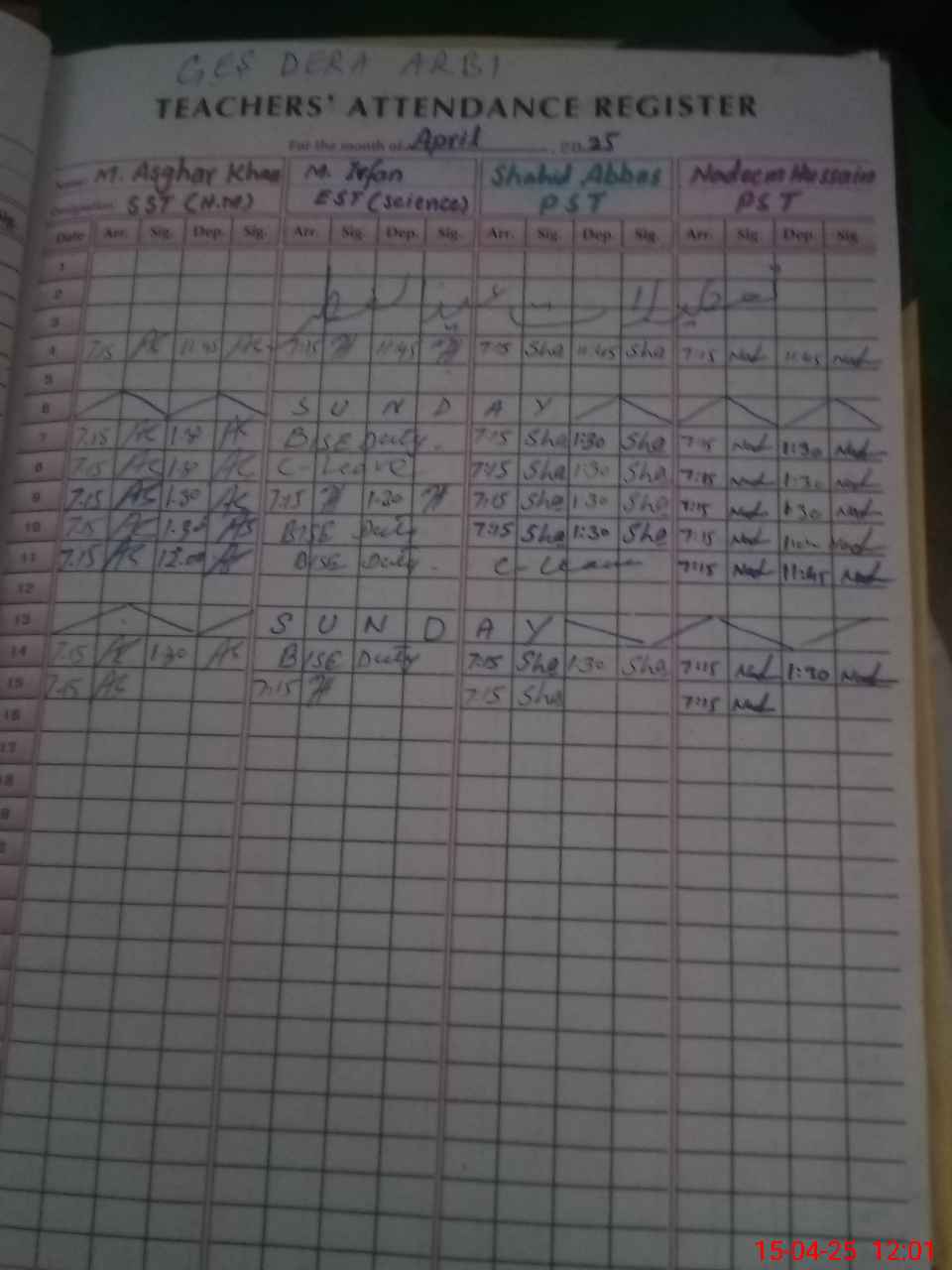 | CNIC | Full Name | Designation | R/C | Absence During Last Calender Month |