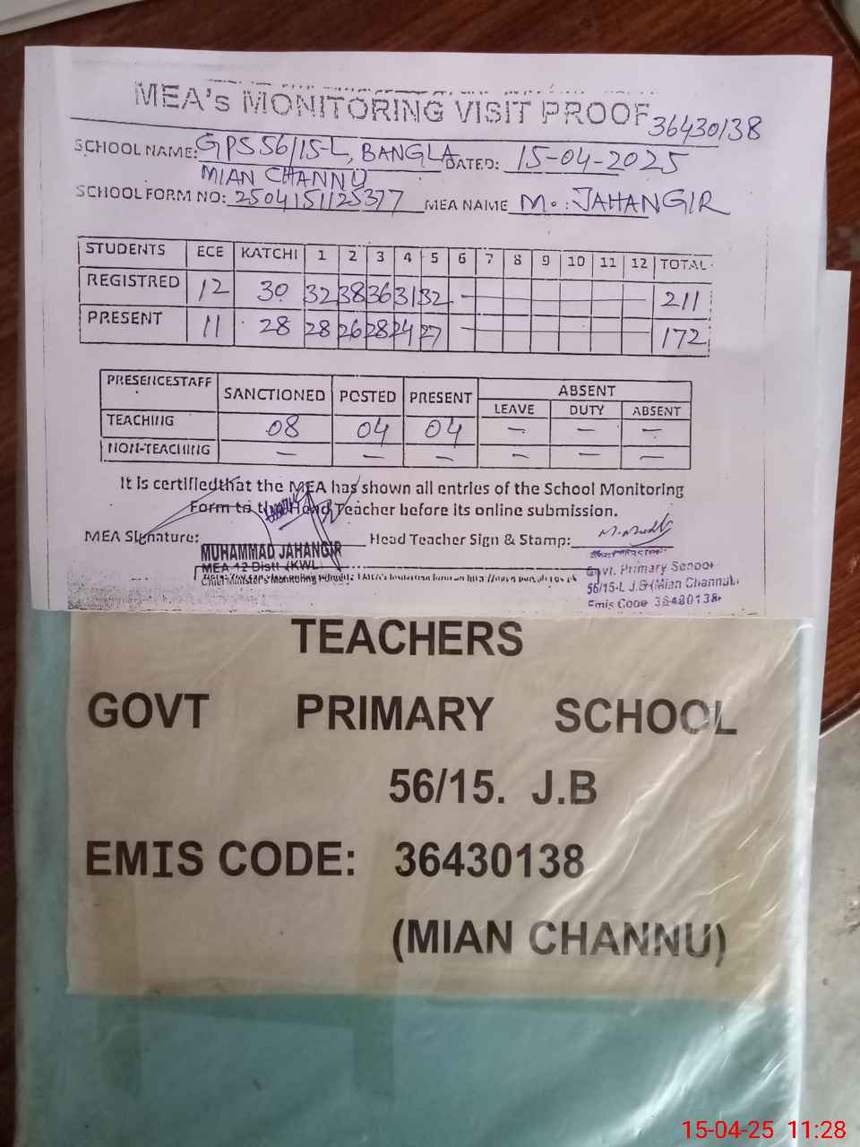 | EMIS Code: 36430138 | Name of School: GPS 56/15-L BANGLA, MIAN CHANNU | |||