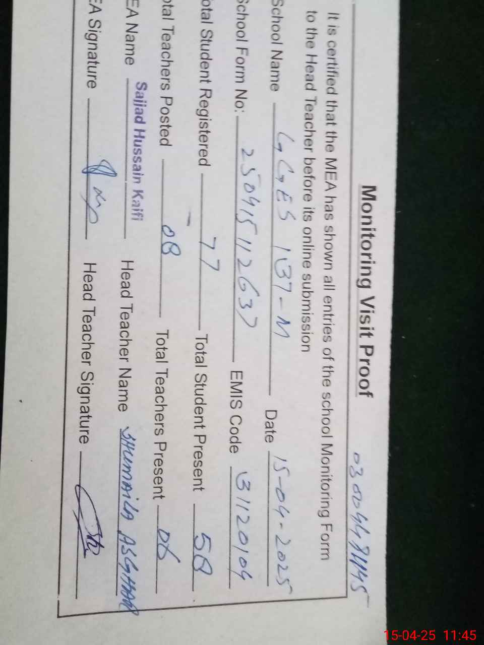 | Attendance Register | Head Teacher | MEA with School | Visit Proof |
