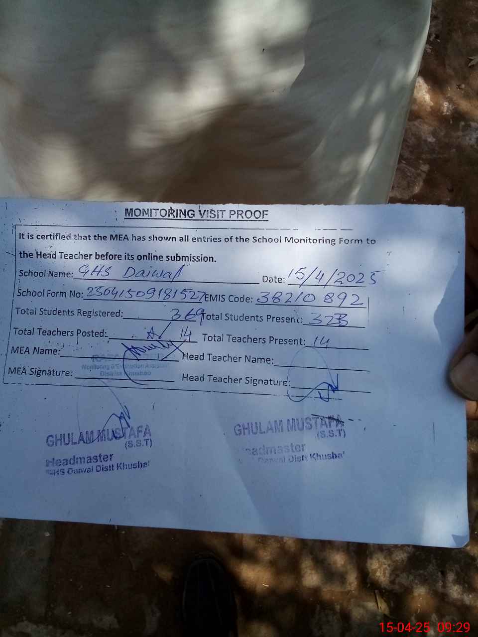| Attendance Register | Head Teacher | MEA with School | Visit Proof |