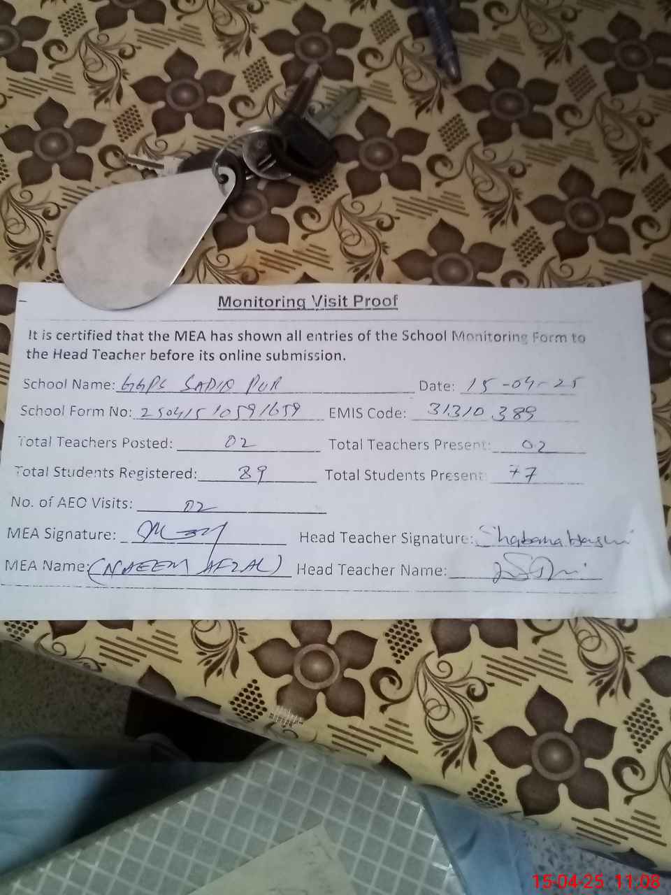 | Attendance Register | Head Teacher | MEA with School | Visit Proof |