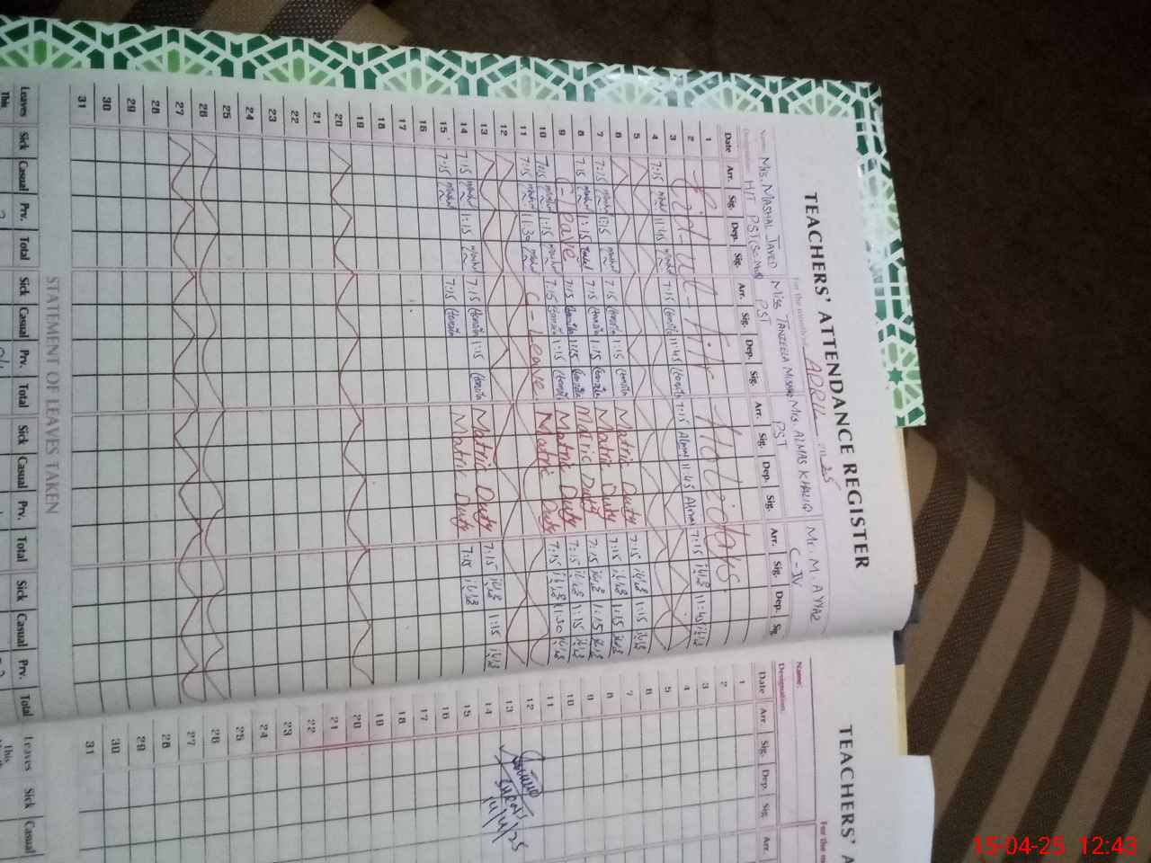 | 31**** | Al**** Kh**** Si**** | 1 | 1 | 0 | 0 | 0 | 0 | 0 | 0 | 0 | 0 | 0 | Exam Duty |