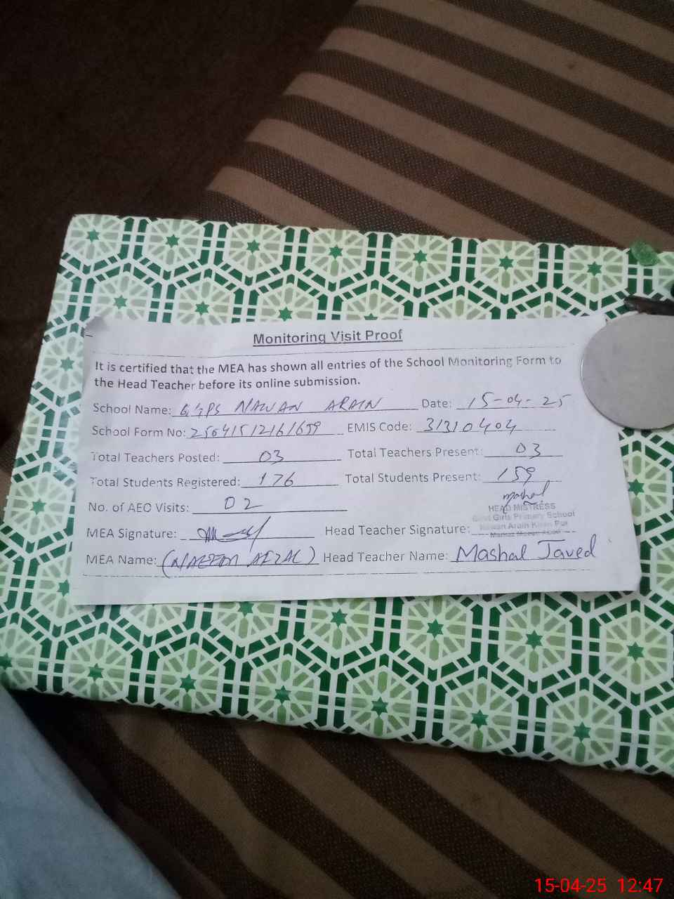 | Attendance Register | Head Teacher | MEA with School | Visit Proof |
