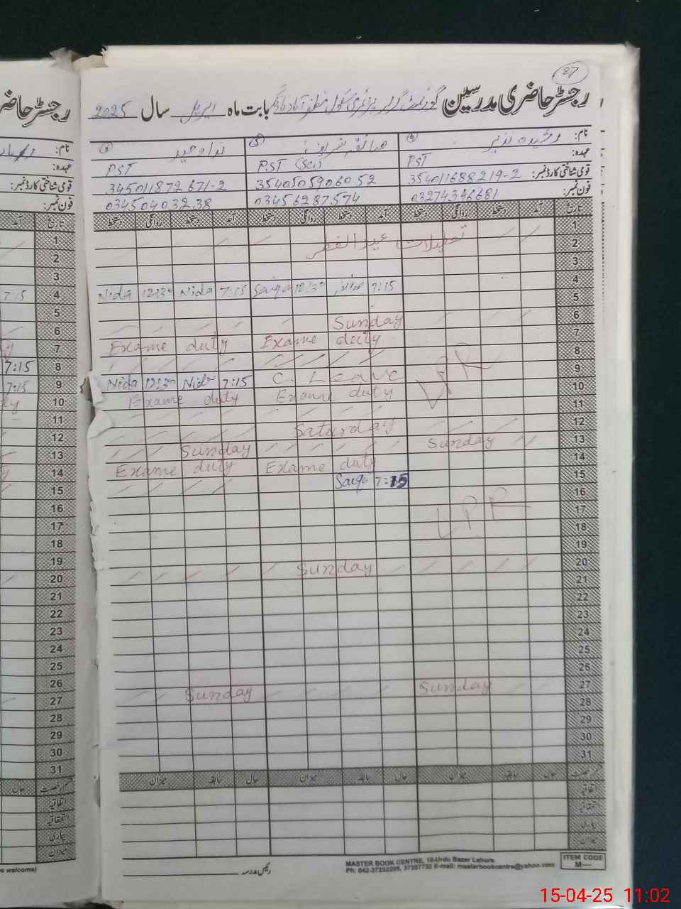 | 35**** | Ru**** Ka**** | PST | Regular | 0 | 0 | 0 | 0 | 0 | 0 | 0 | 0 | 0 | Exam Duty |