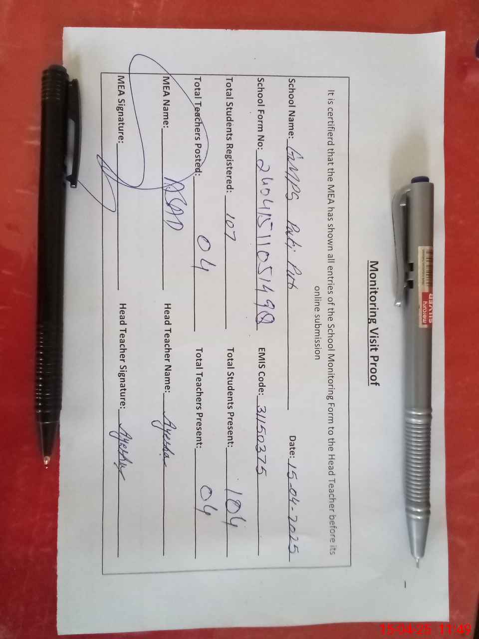 | Attendance Register | Head Teacher | MEA with School | Visit Proof |