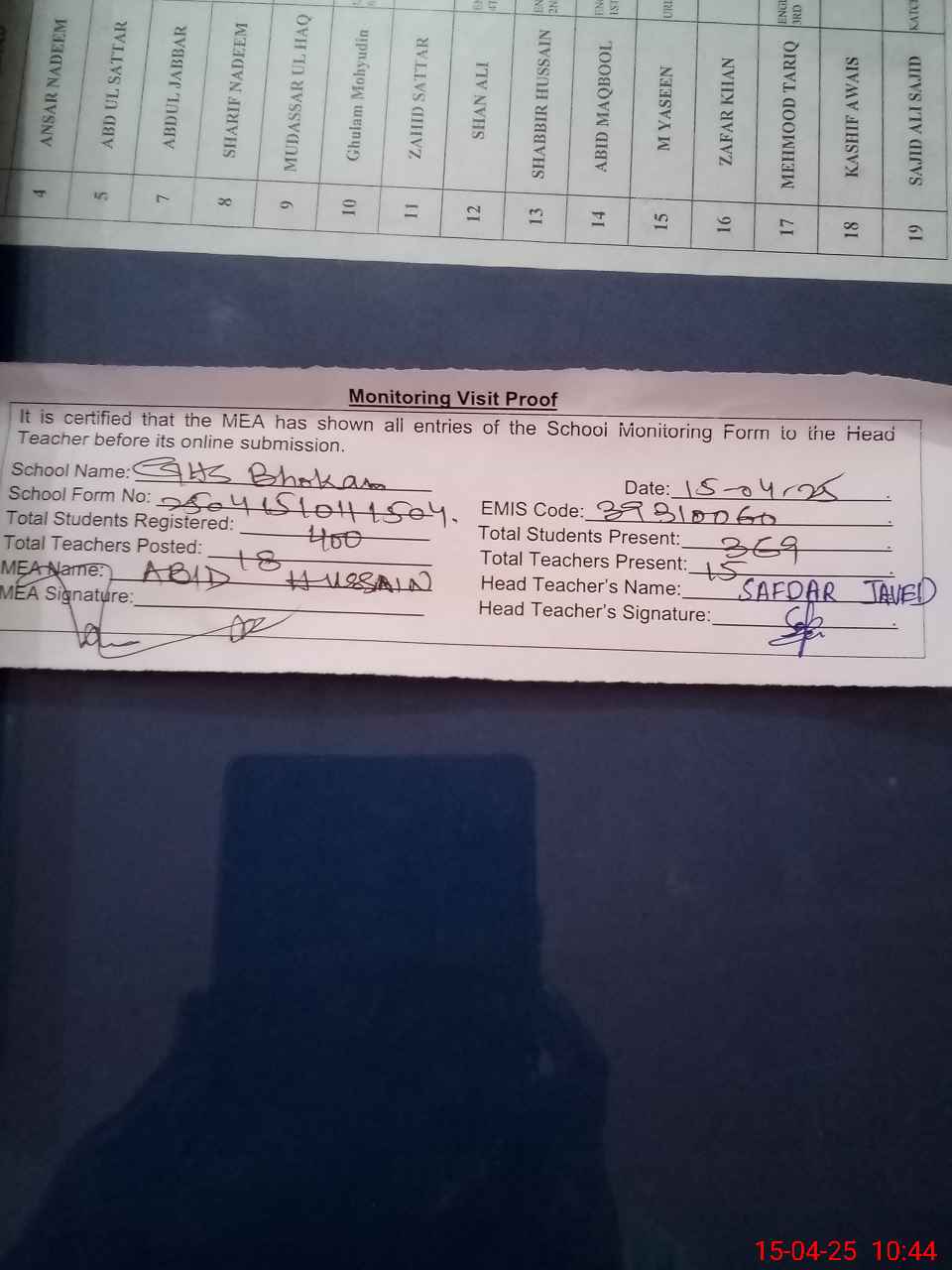| Attendance Register | Head Teacher | MEA with School | Visit Proof |