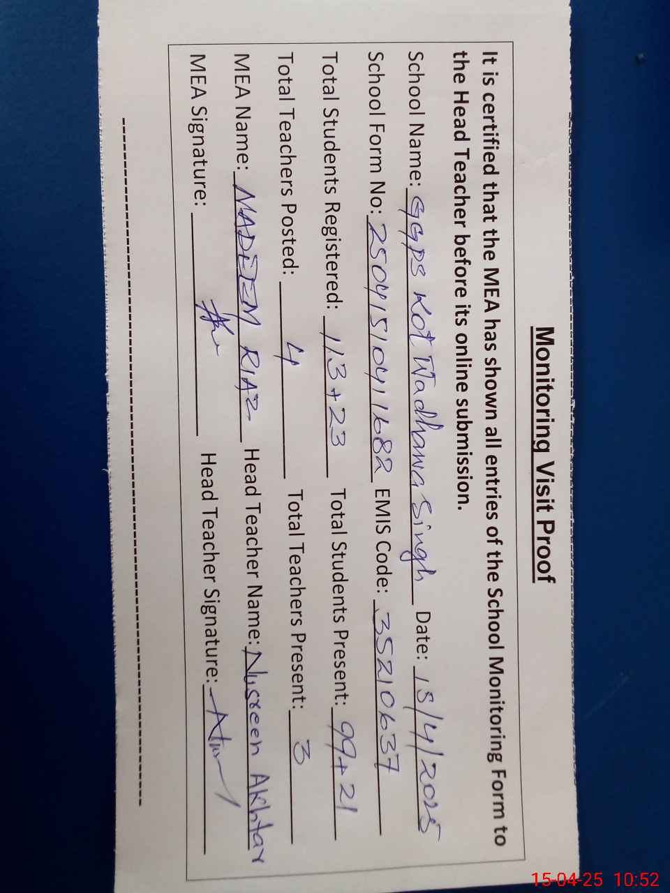 | EMIS Code: 35210637 | Name of School: GGPS KOT WADAWA SINGH BADIAN ROAD | |||