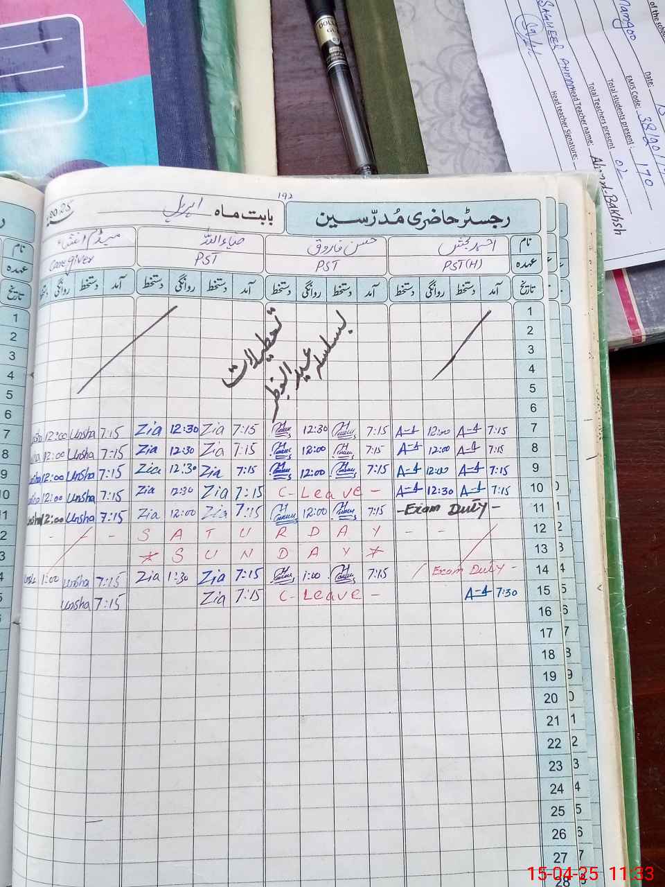| Leave | Duty | Absent | Maternity | Medical | Ex- Pak |