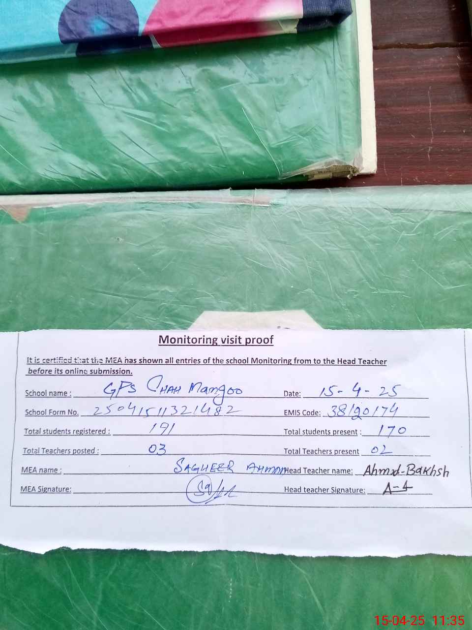 | Attendance Register | Head Teacher | MEA with School | Visit Proof |