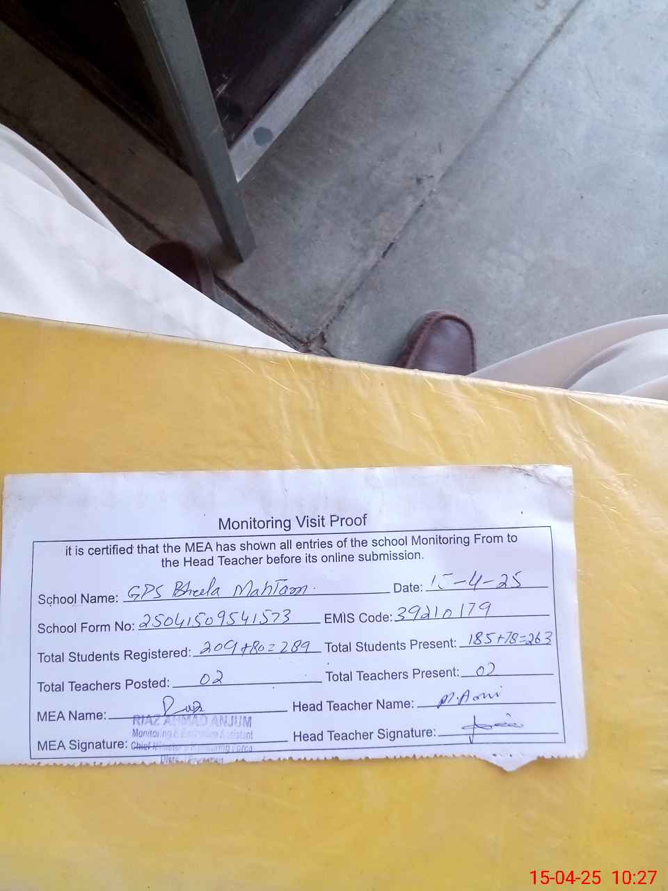 | Attendance Register | Head Teacher | MEA with School | Visit Proof |