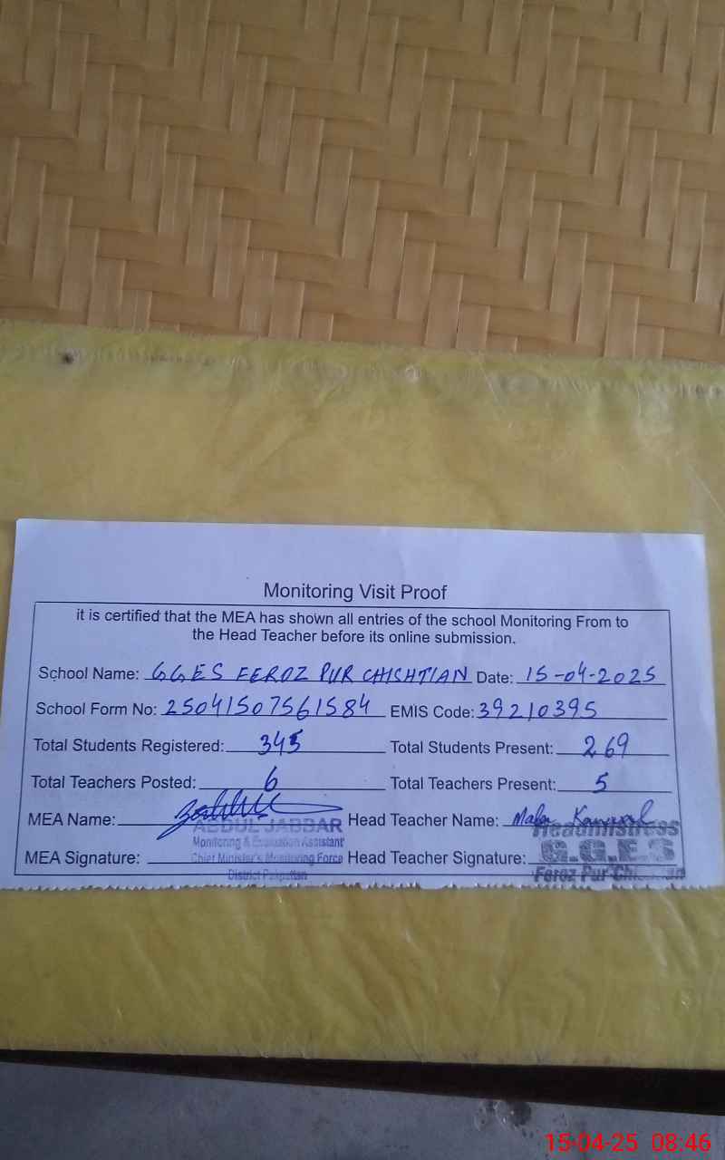 | EMIS Code: 39210395 | Name of School: GGES FEROZ PUR CHISHTIAN | |||