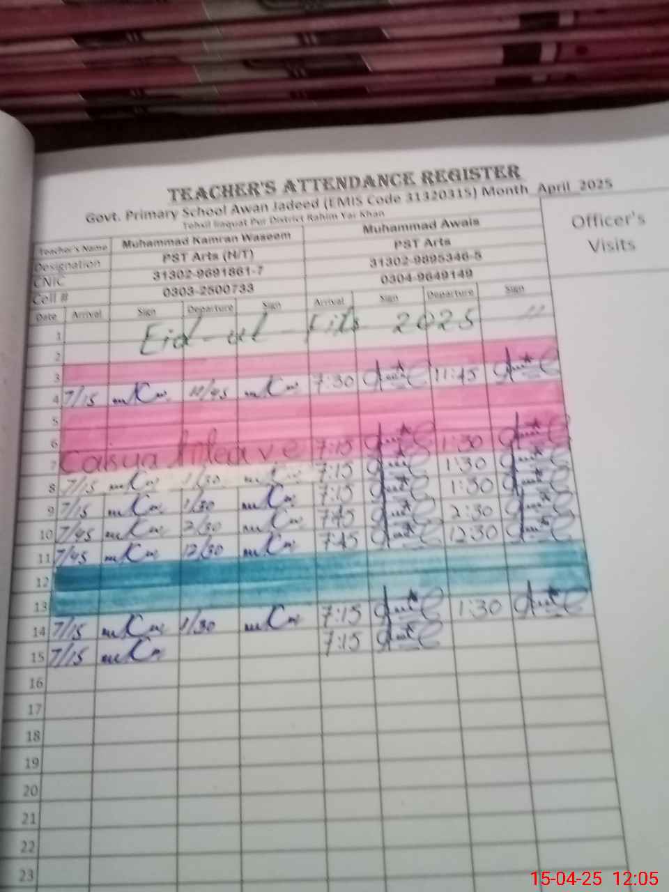 | CNIC | Full Name | Designation | R/C | Absence during last cal. month |