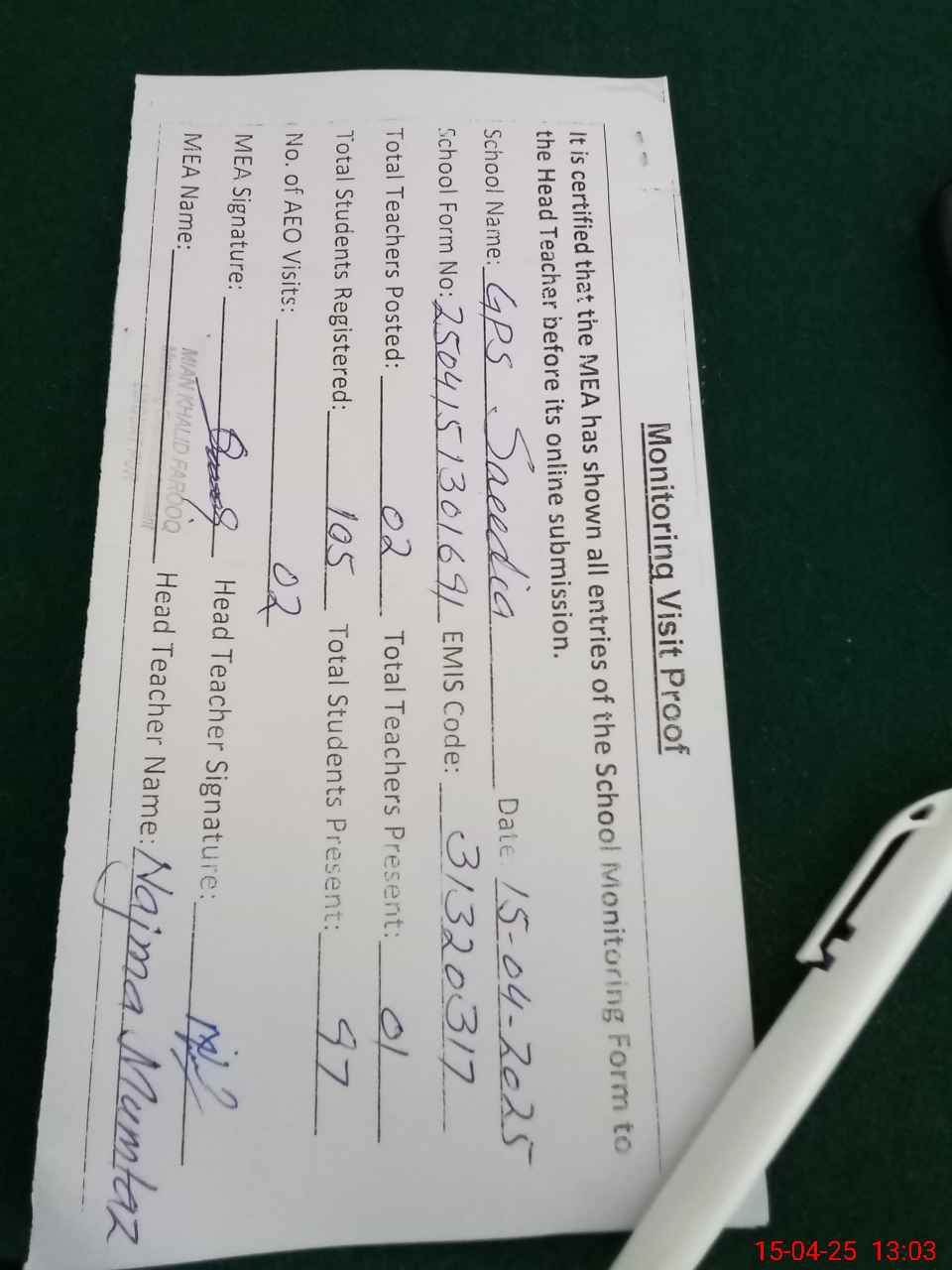 | Attendance Register | Head Teacher | MEA with School | Visit Proof |