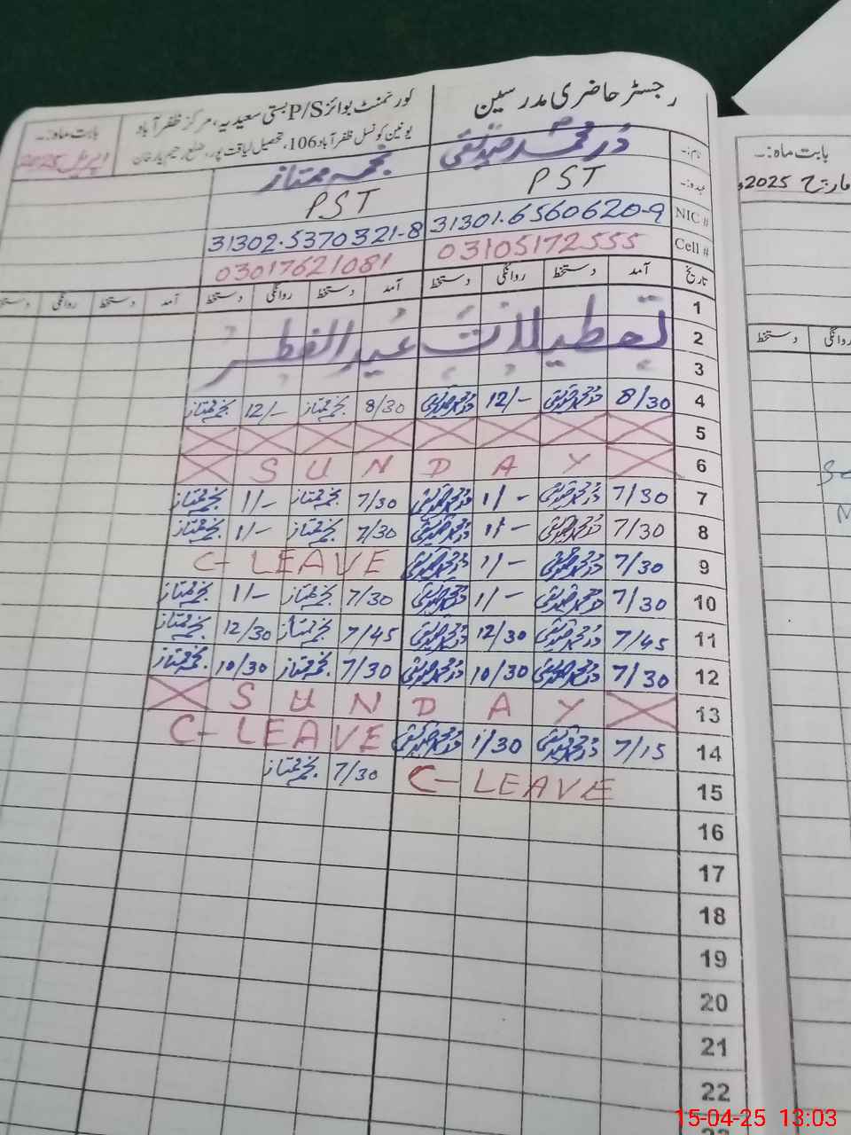 | CNIC | Full Name | Designation | R/C | Absence During Last Calender Month |
