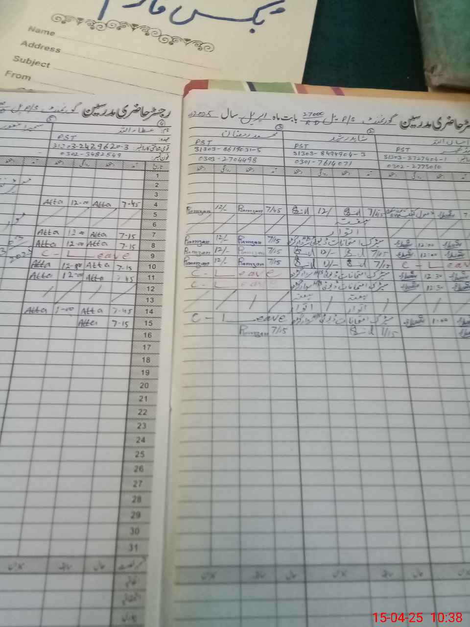 | CNIC | Full Name | Designation | R/C | Absence During Last Calender Month |