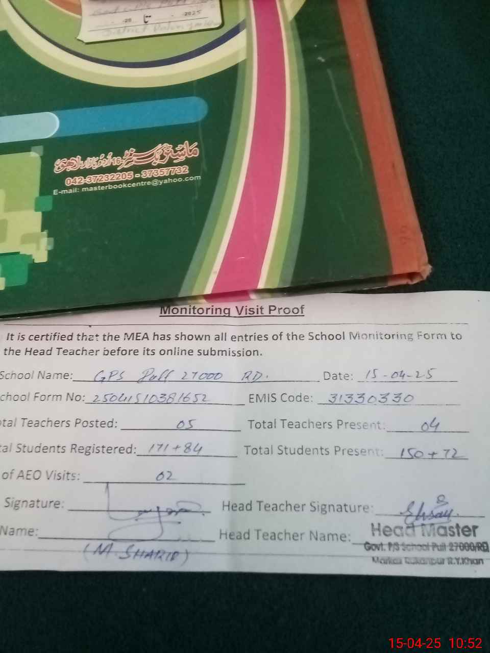 | Attendance Register | Head Teacher | MEA with School | Visit Proof |