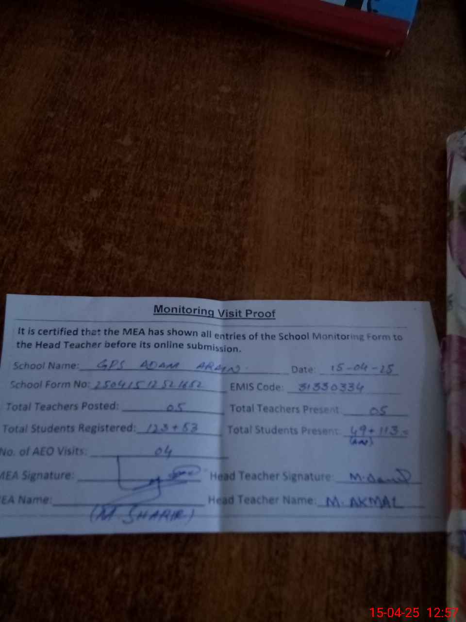 | Attendance Register | Head Teacher | MEA with School | Visit Proof |