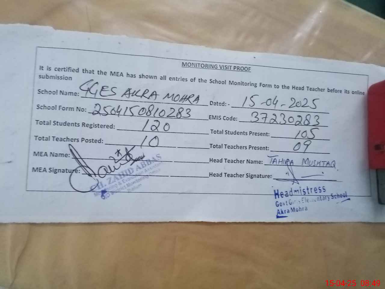 | Attendance Register | Head Teacher | MEA with School | Visit Proof |