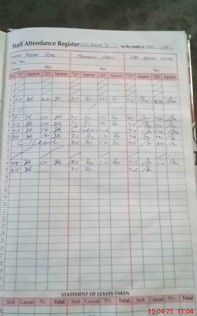 | 37**** | Ma**** Al**** | CHOKIDAR | Regular | 0 | 0 | 0 | 0 | 0 | 0 | 0 | 0 | 0 | Casual |