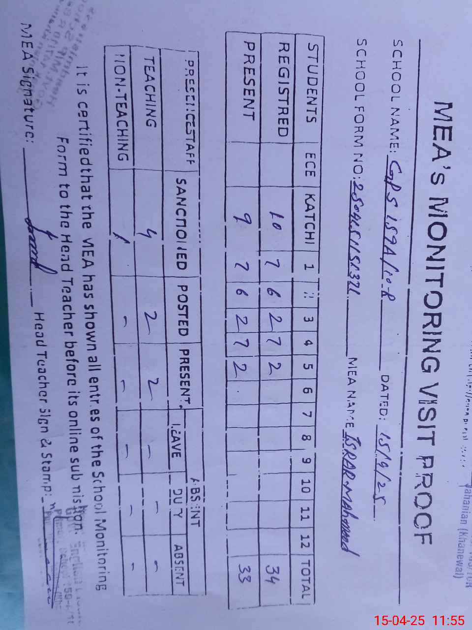 | Attendance Register | Head Teacher | MEA with School | Visit Proof |