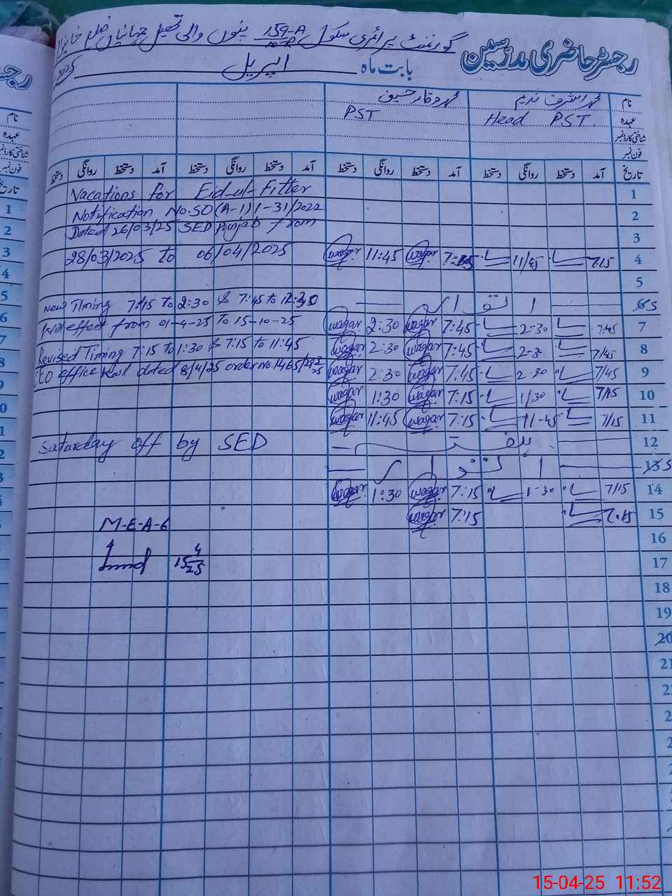 | Name: M.AS**** Designation: (School Headmaster's/Headmistress's) PST Phone/Cell Number: 03**** |