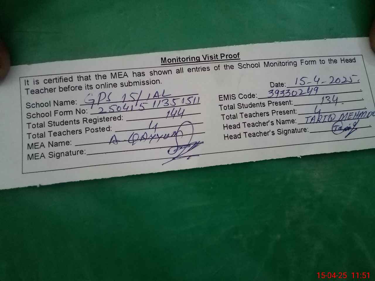 | EMIS Code: 39330249 | Name of School: GPS CHAK NO 15/1-AL | |||