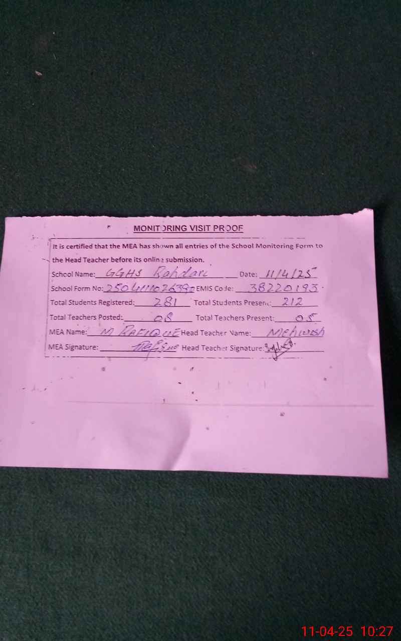 | EMIS Code: 38220193 | Name of School: GGHS RAHDARI | |||