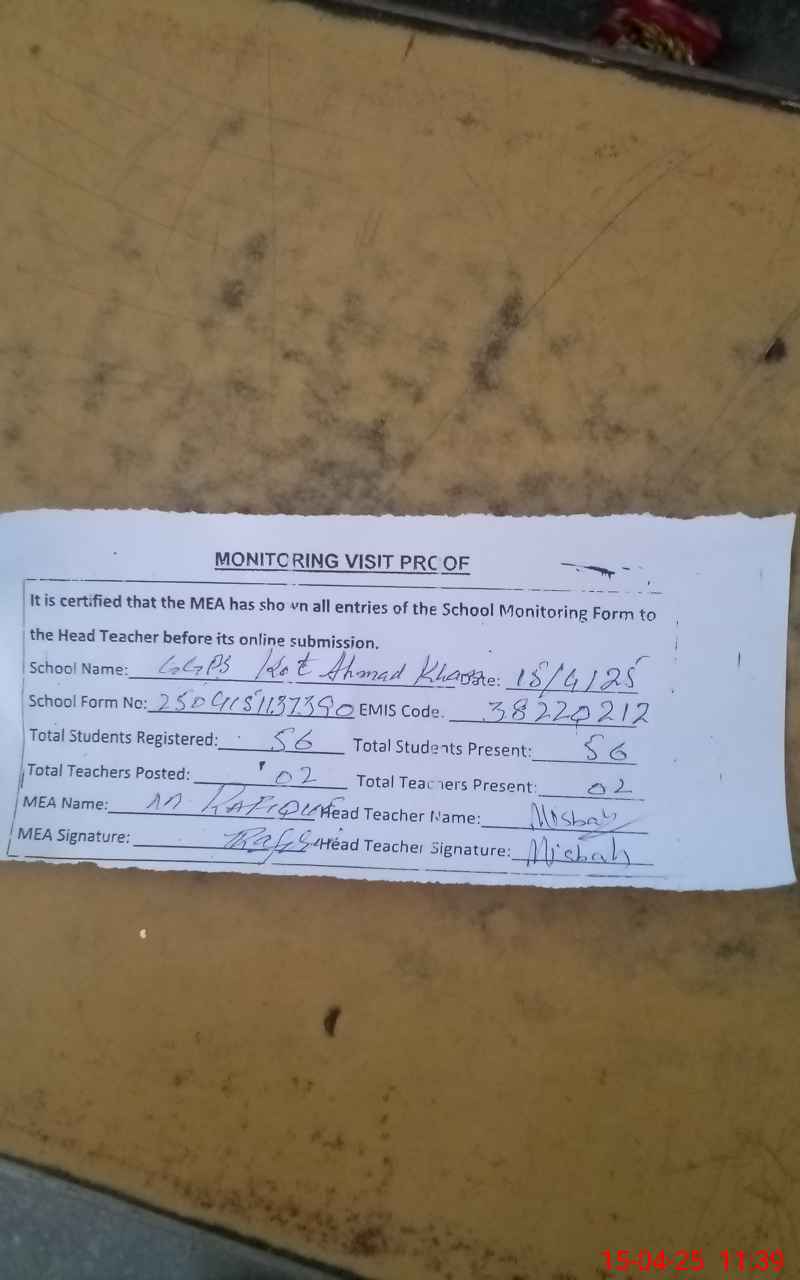 | EMIS Code: 38220212 | Name of School: GGPS KOT AHMAD KHAN | |||