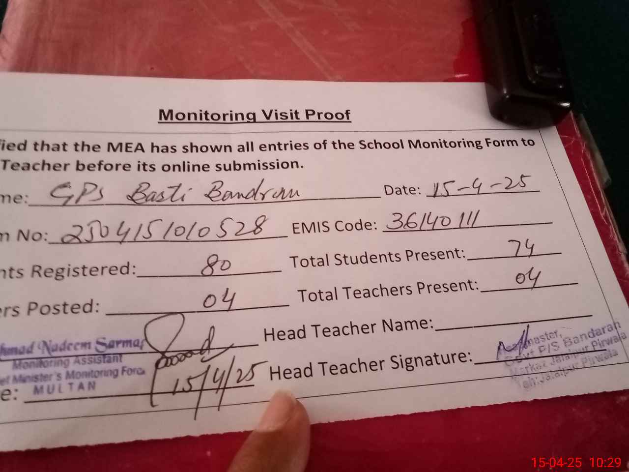 | Attendance Register | Head Teacher | MEA with School | Visit Proof |