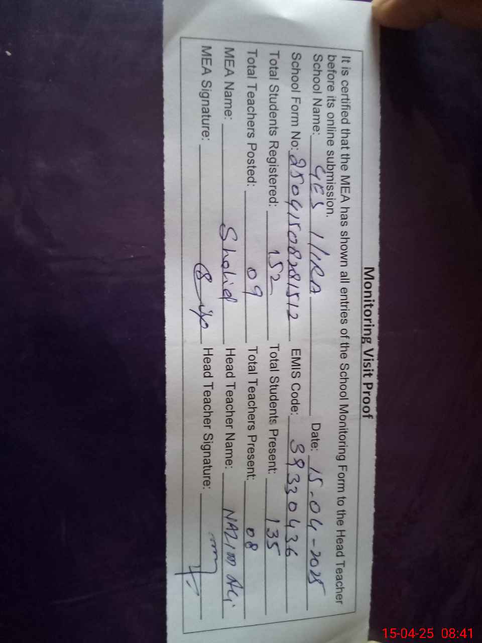 | Attendance Register | Head Teacher | MEA with School | Visit Proof |
