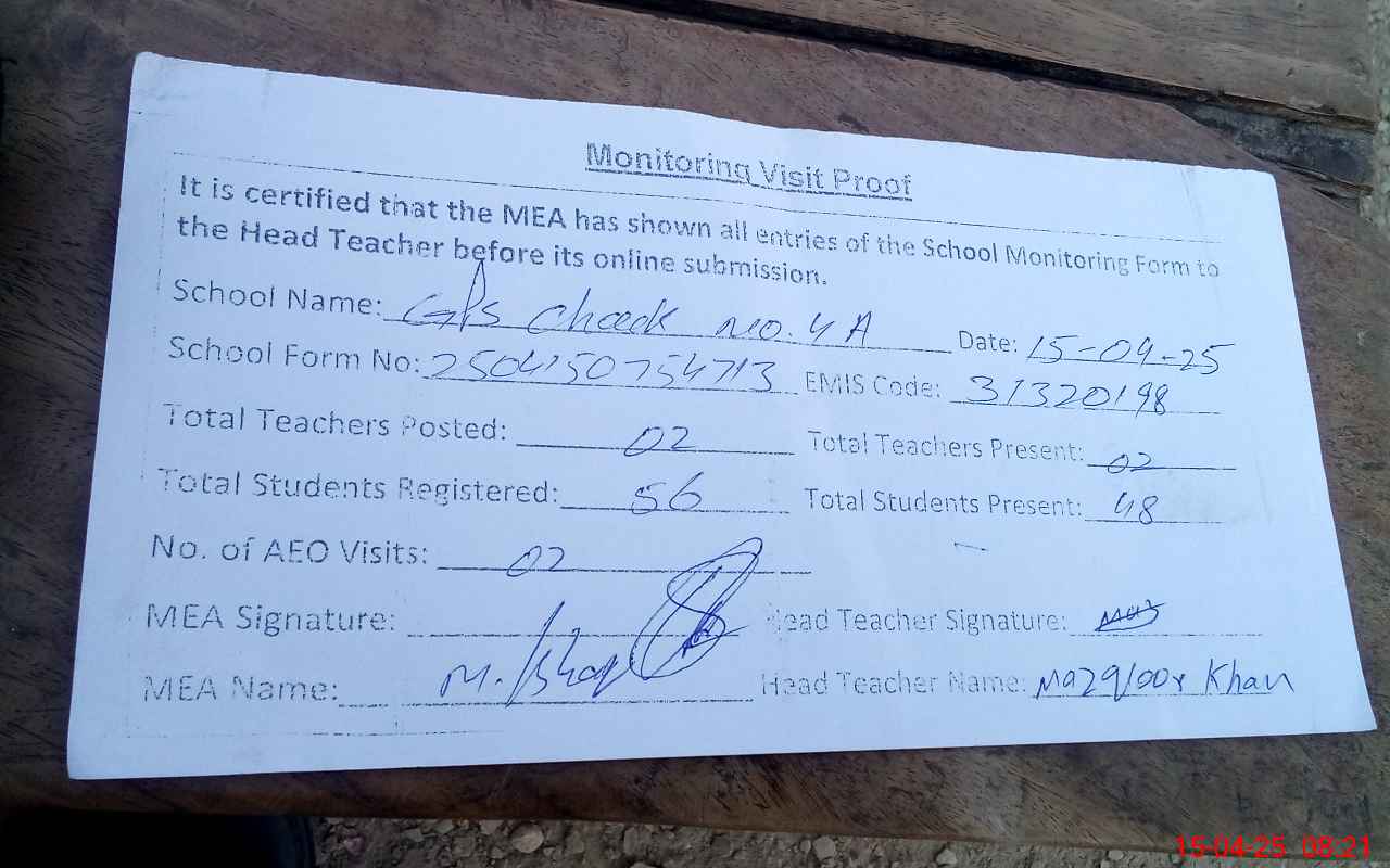 | EMIS Code: 31320198 | Name of School: GPS CHAK 4/A | |||