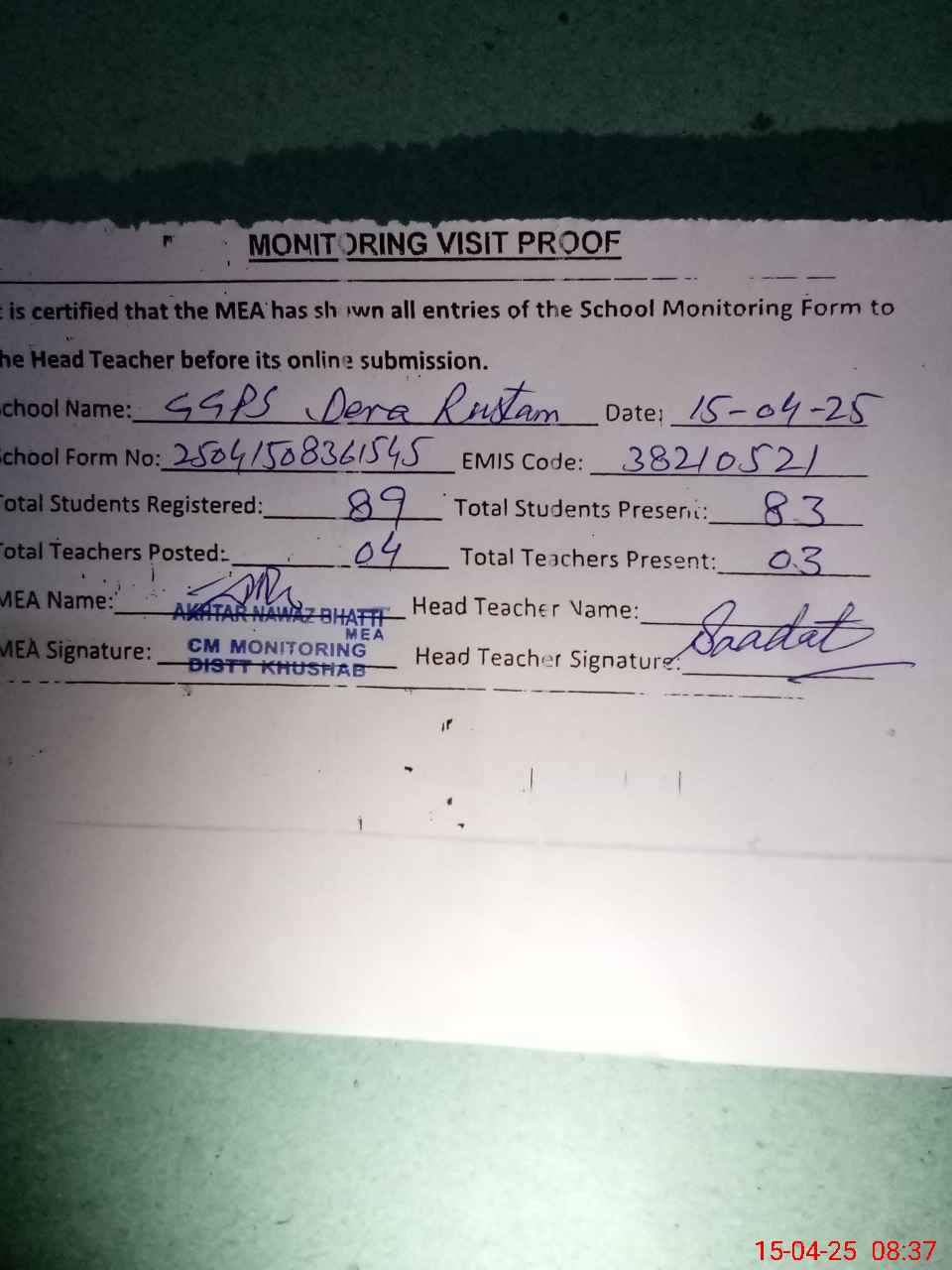 | Attendance Register | Head Teacher | MEA with School | Visit Proof |