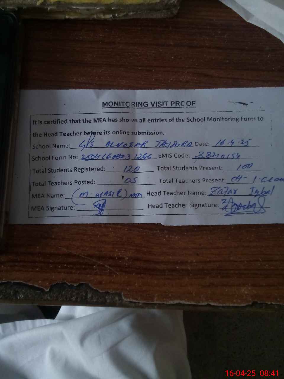 | Attendance Register | Head Teacher | MEA with School | Visit Proof |