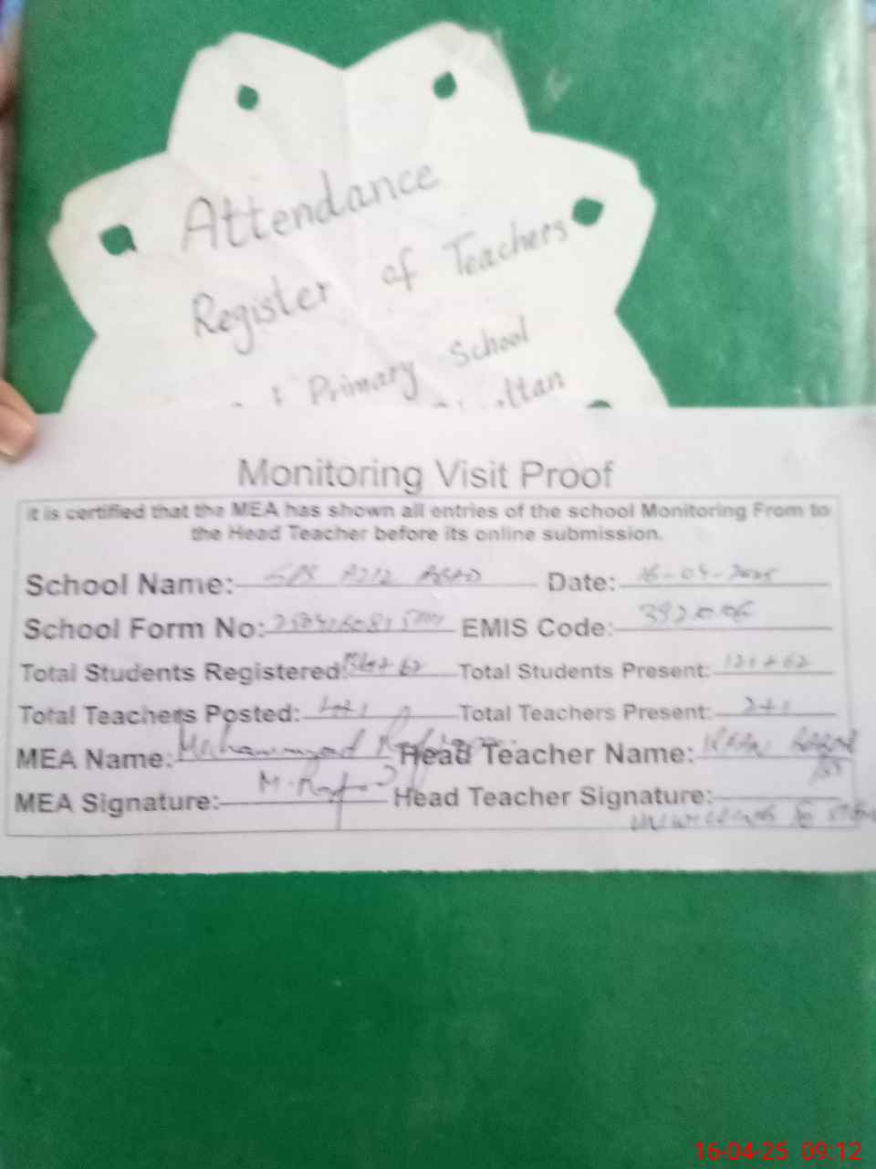 | Attendance Register | Head Teacher | MEA with School | Visit Proof |