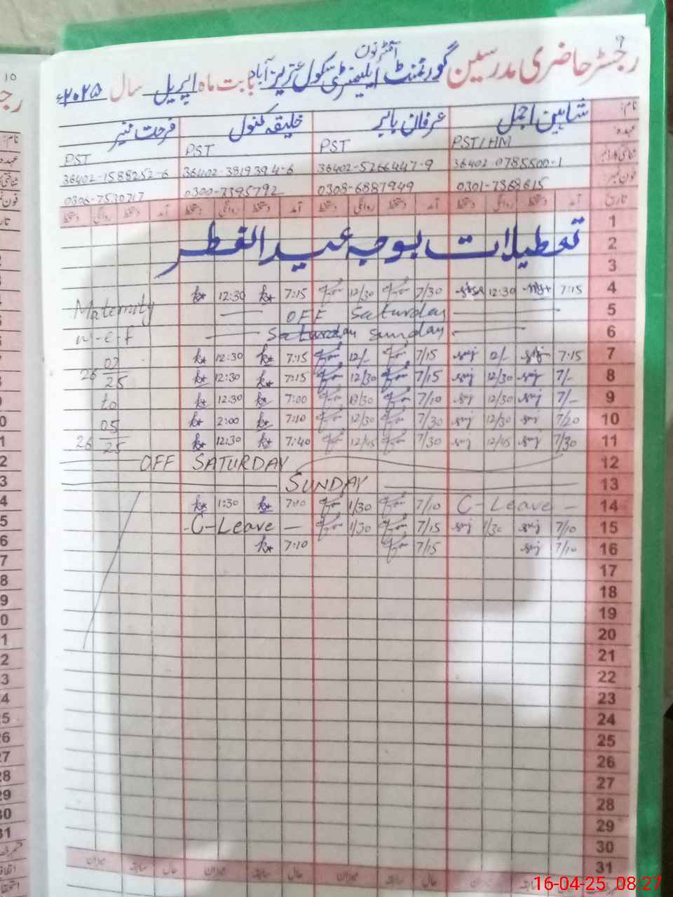 | 36**** | Fa**** Mu**** | PST | Regular | 16 | 0 | 0 | 16 | 0 | 0 | 0 | 0 | 0 | Maternity |