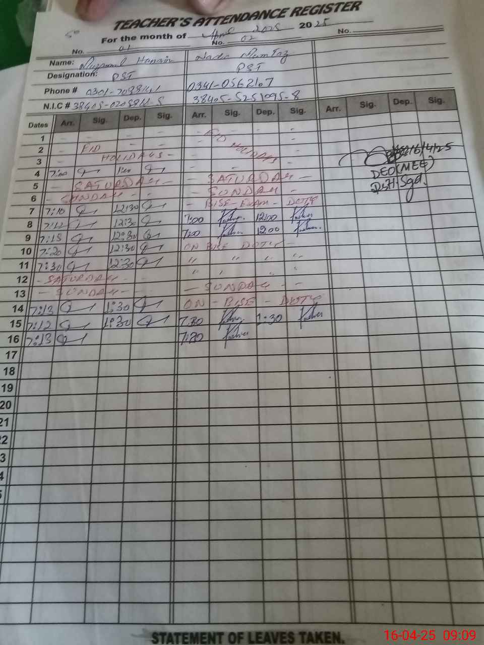 | Name: Mu**** Hu**** Designation: (School Headmaster's/Headmistress's) PST Phone/Cell Number: 03**** |