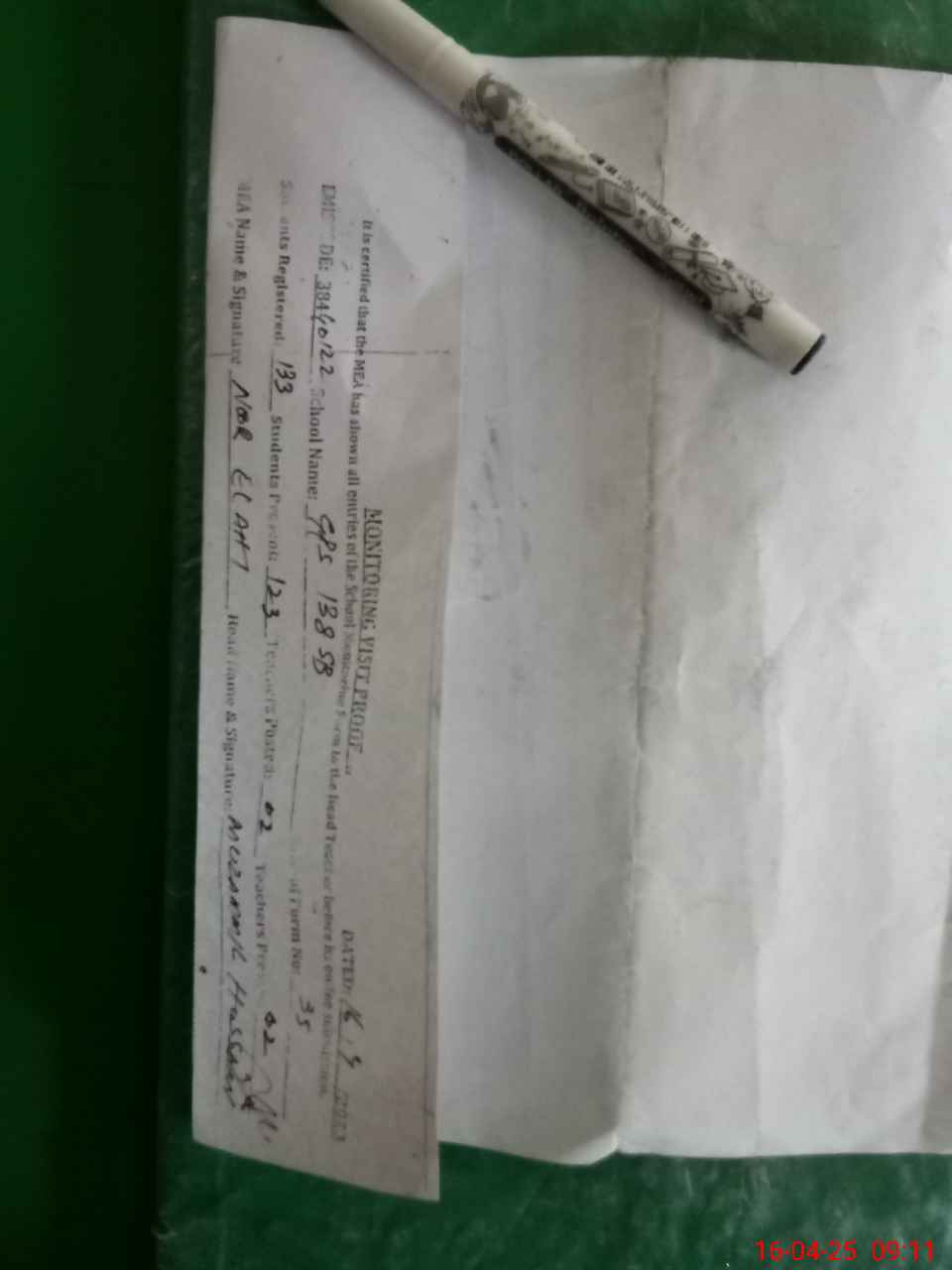 | Attendance Register | Head Teacher | MEA with School | Visit Proof |