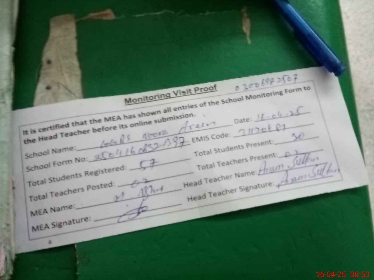 | Attendance Register | Head Teacher | MEA with School | Visit Proof |