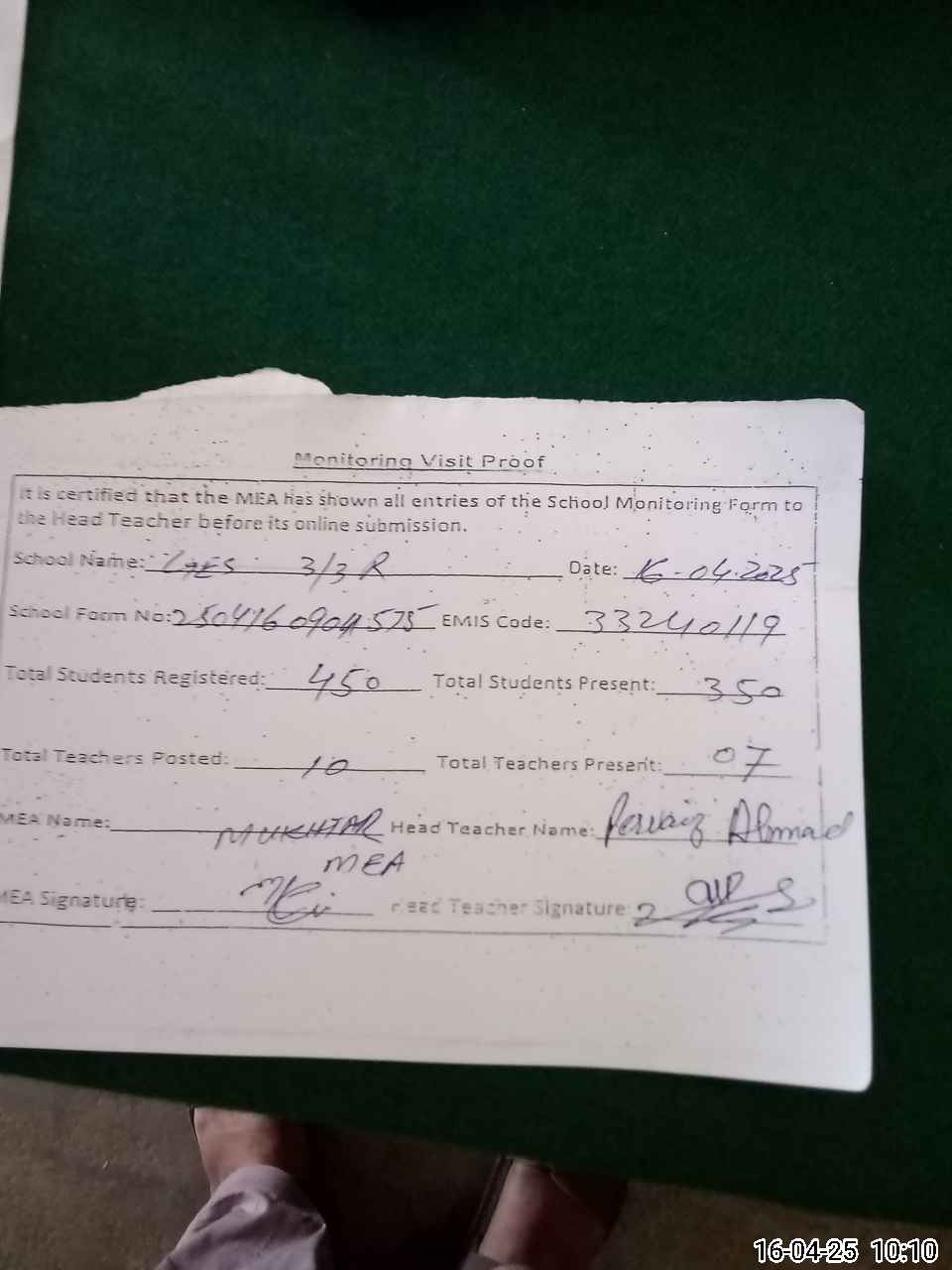 | Attendance Register | Head Teacher | MEA with School | Visit Proof |