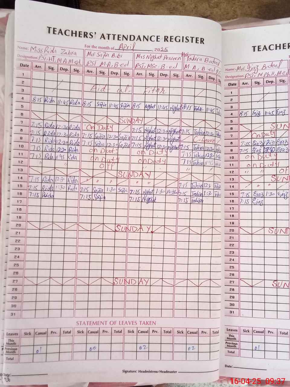 | Leave | Duty | Absent | Maternity | Medical | Ex- Pak |