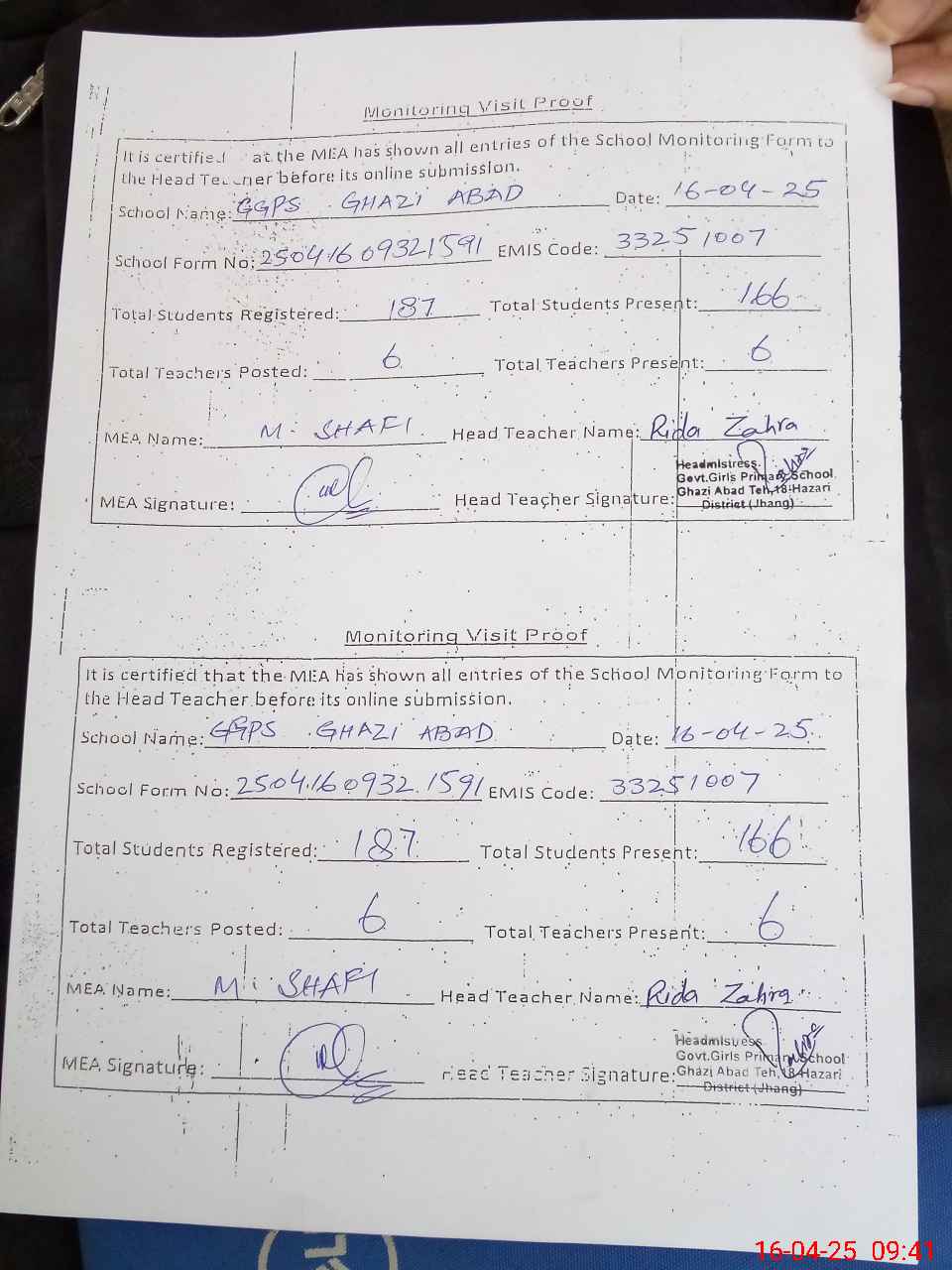| Attendance Register | Head Teacher | MEA with School | Visit Proof |