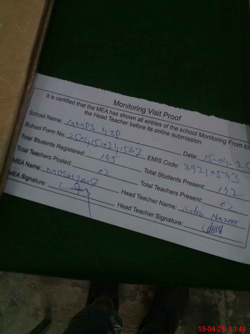 | Attendance Register | Head Teacher | MEA with School | Visit Proof |