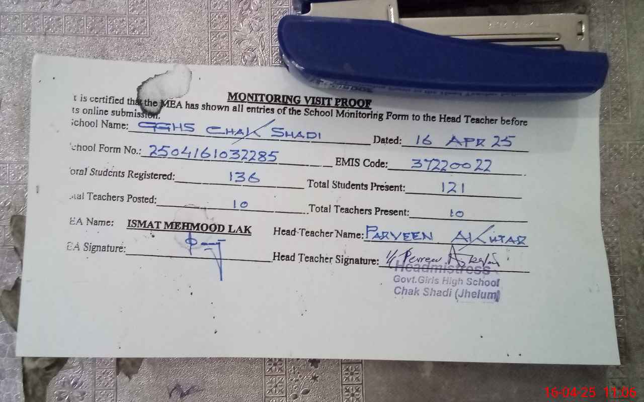 | EMIS Code: 37220022 | Name of School: GGHS CHAK SHADI | |||
